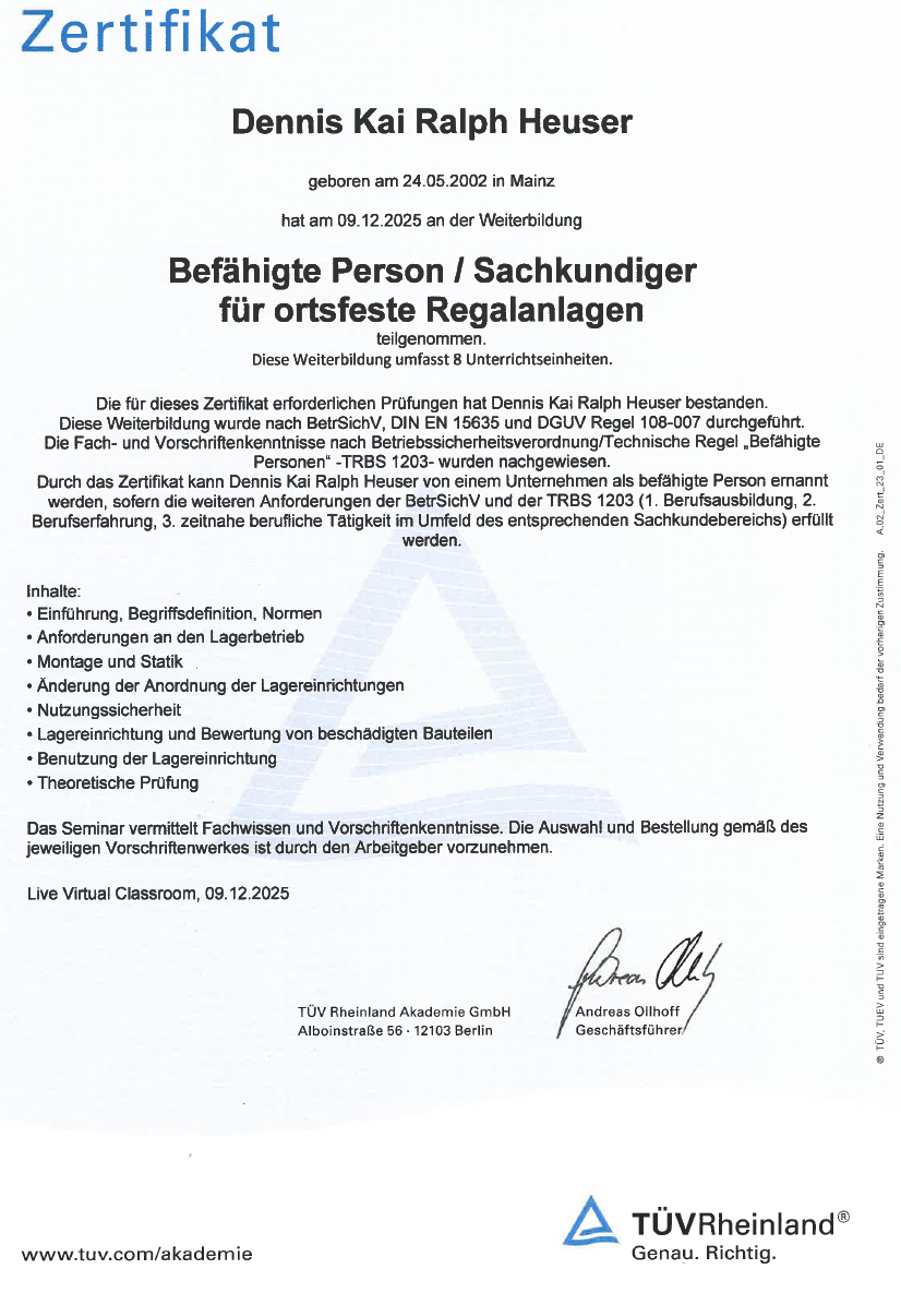 Unsere engagierten Mitarbeiter haben erfolgreich an der Schulung “Befähigte Person/Sachkundiger für Ortsfeste Regalanlagen” teilgenommen.